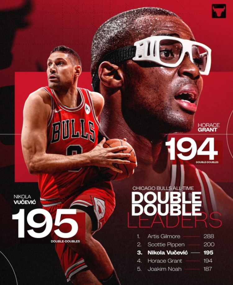 2025-03-11 10:58:08武切维奇公牛两双数超越”眼镜蛇“格兰特 上升至队史第三位