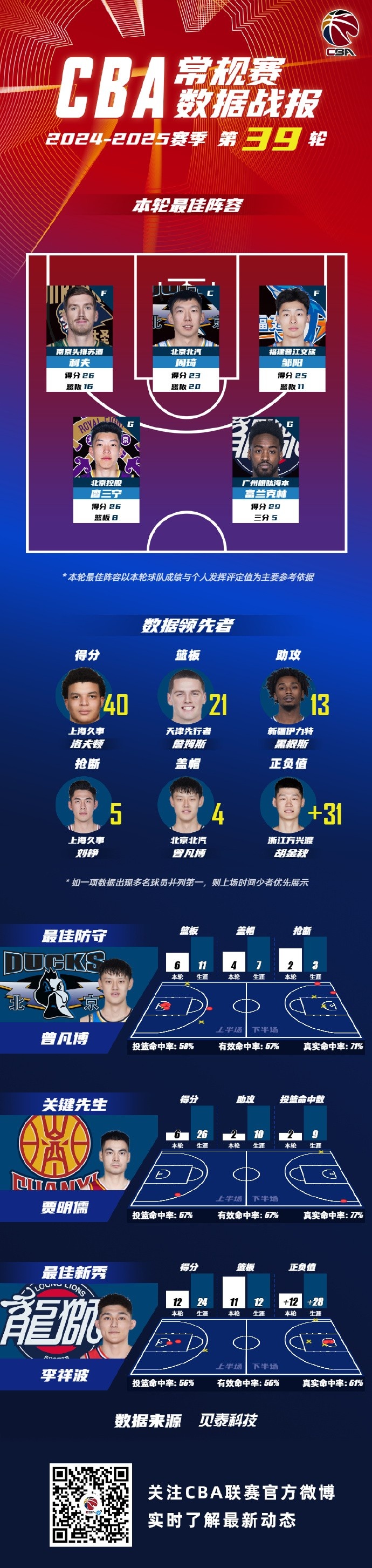 第39轮最佳防守球员由来自北京北汽的曾凡博获得;