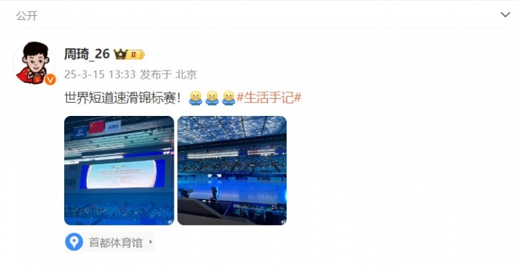 2025-03-15 20:40:46放松一下!周琦社媒晒观战短道速滑世锦赛的图片