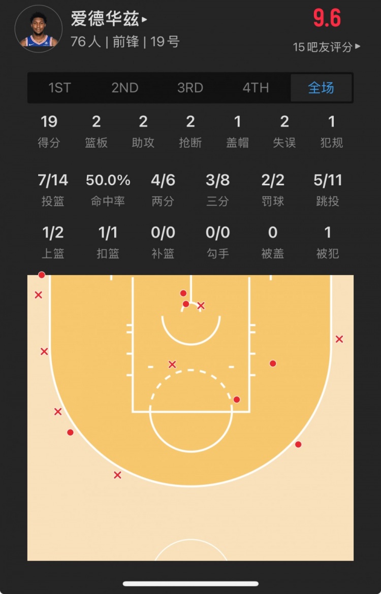 76人落选秀 贾斯汀-爱德华兹 登场30.4分钟