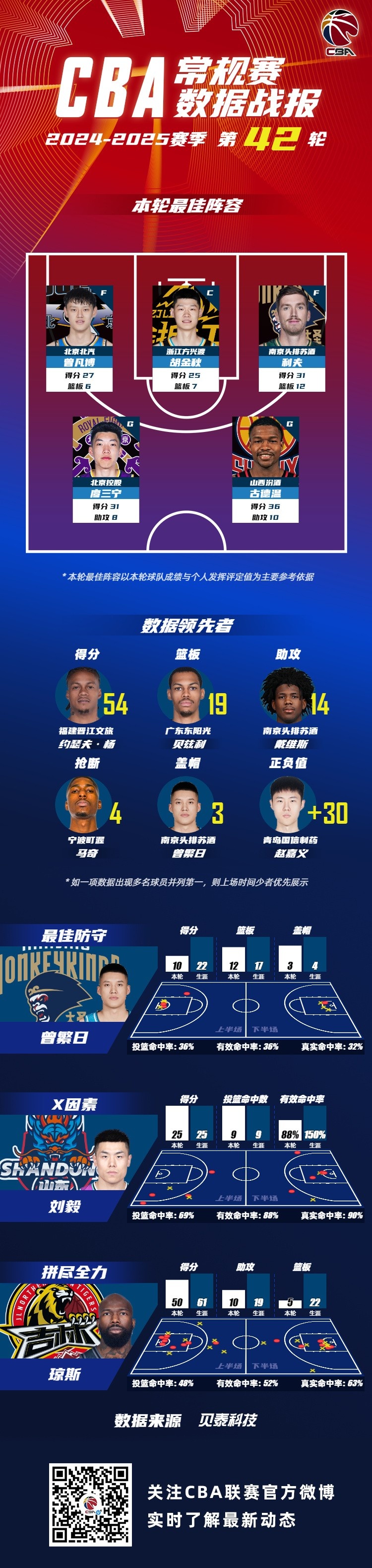 2024-2025赛季CBA联赛常规赛第42轮结束较量,来自北京首钢篮球俱乐部的曾凡博 ,浙江广厦篮球俱乐部的胡金秋,南京同曦篮球俱乐部的利夫,北京控股篮球俱乐部的廖三宁和山西汾酒职业篮球俱乐部的古德温入选CBA联赛常规赛第42轮最佳阵容!