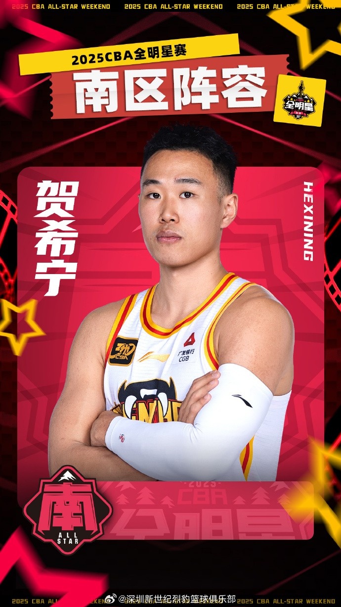 贺希宁在个人微博上写道:“荣幸能再次参与全明星。回想第一次参加广州的全明星,我更多是兴奋和忐忑,如今更懂得这份荣誉背后承载的不仅是球迷的热爱和教练组的信任,更承载着CBA三十年来无数人的热爱与坚持。