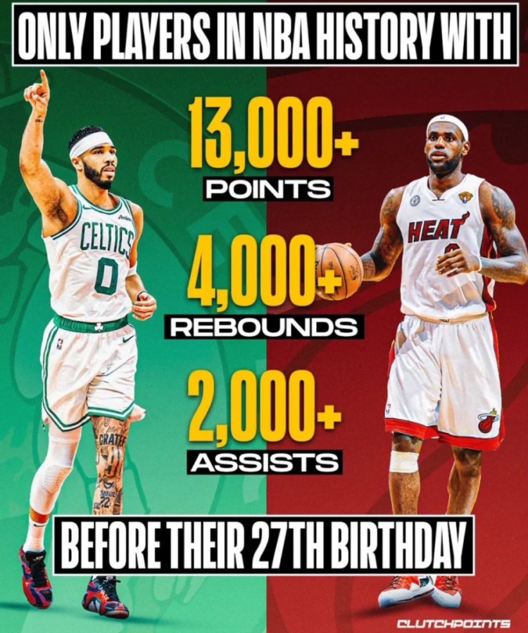 2025-03-04 10:22:50塔图姆27岁前至少13000分4000板2000助 历史唯二&比肩詹姆斯