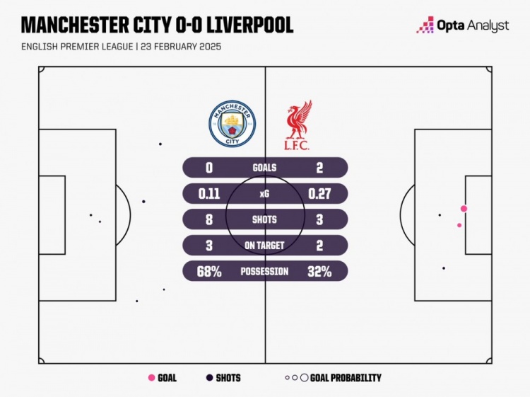 2025-02-24 12:12:13曼城0-2利物浦半场数据:控球率68%-32%,射门8-3,射正3-2