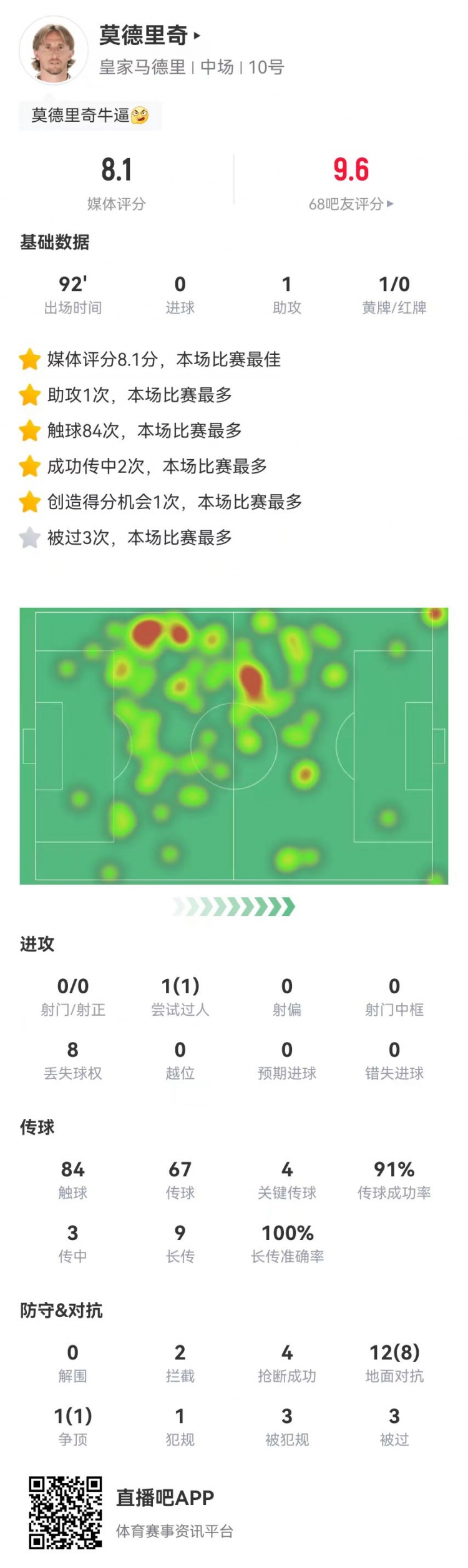 2025-03-10 02:57:09莫德里奇本场1助攻4关键传球 10长传9成功 13对抗9成功 8.1分最高