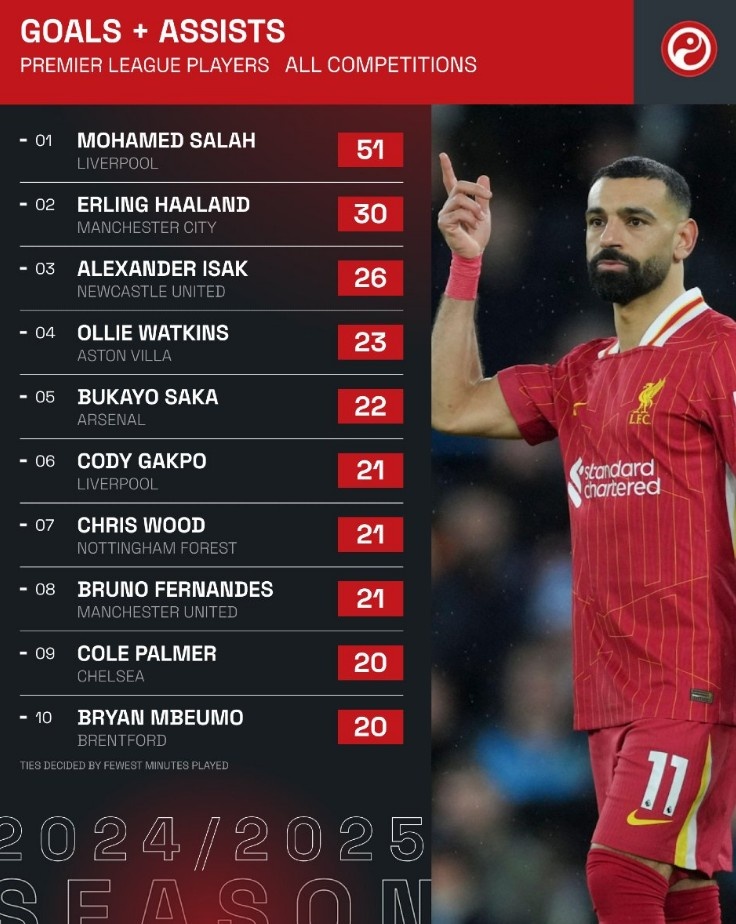 2025-02-24 20:00:21本赛季英超球员各项赛事参与进球榜:萨拉赫51球居首,哈兰德次席