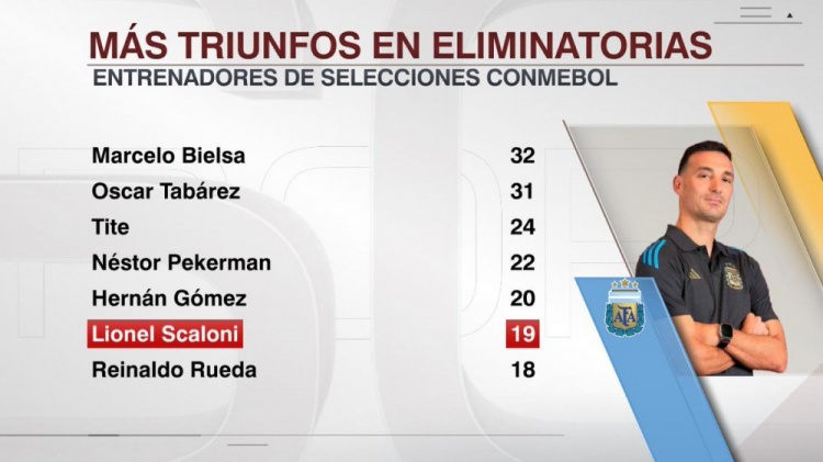 2025-03-22 10:39:47斯卡洛尼执教阿根廷世预赛取胜19场,南美国家队主帅第6多