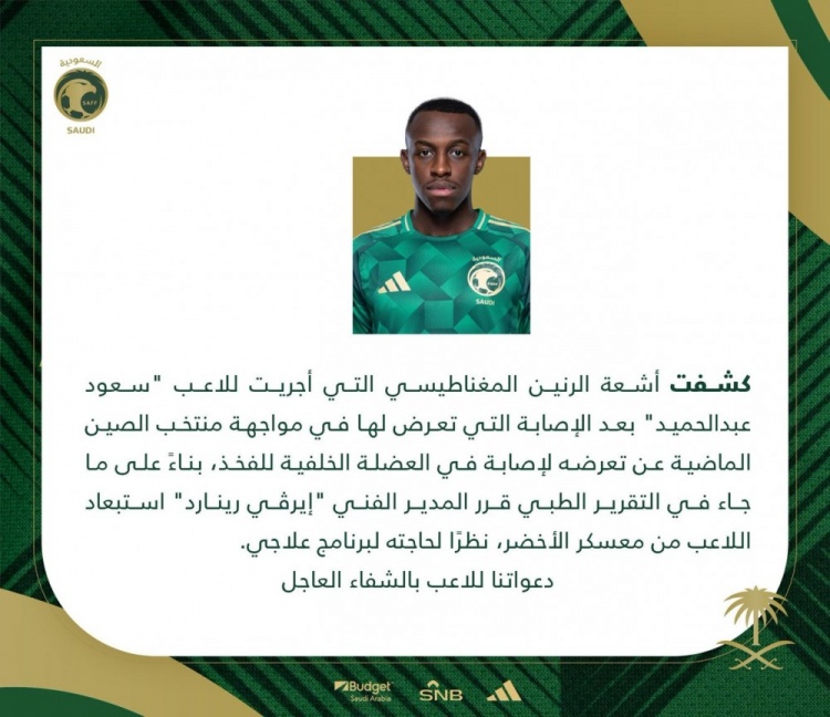 2025-03-23 00:01:03官方:阿卜杜勒哈米德对阵国足时肌肉拉伤,退出本期沙特名单
