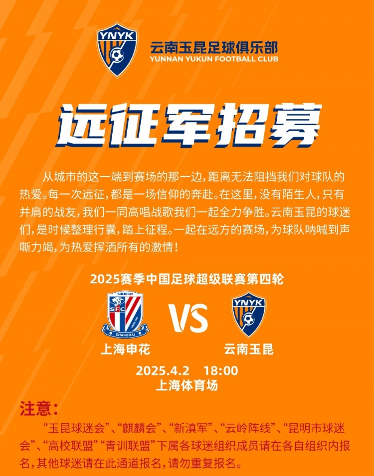 2025-03-25 19:30:36中超第4轮云南玉昆将客场挑战上海申花,球迷远征报名已正式开启