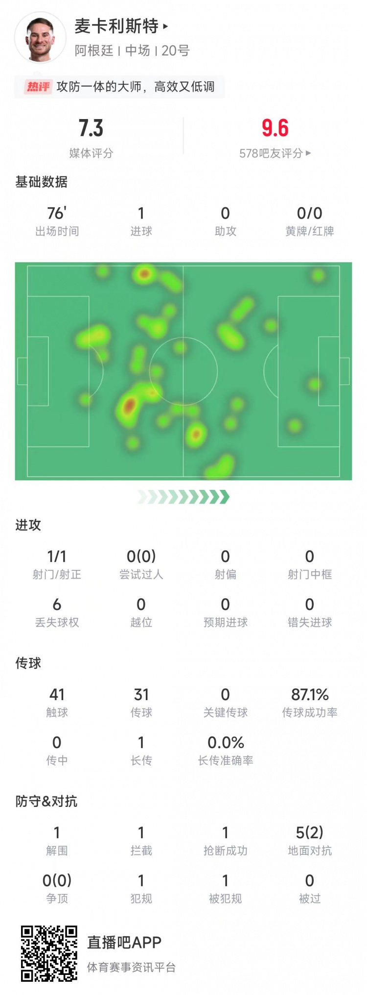 2025-03-26 10:33:20麦卡利斯特本场数据:射门1次打进1球,传球成功率87.1%&评分7.3