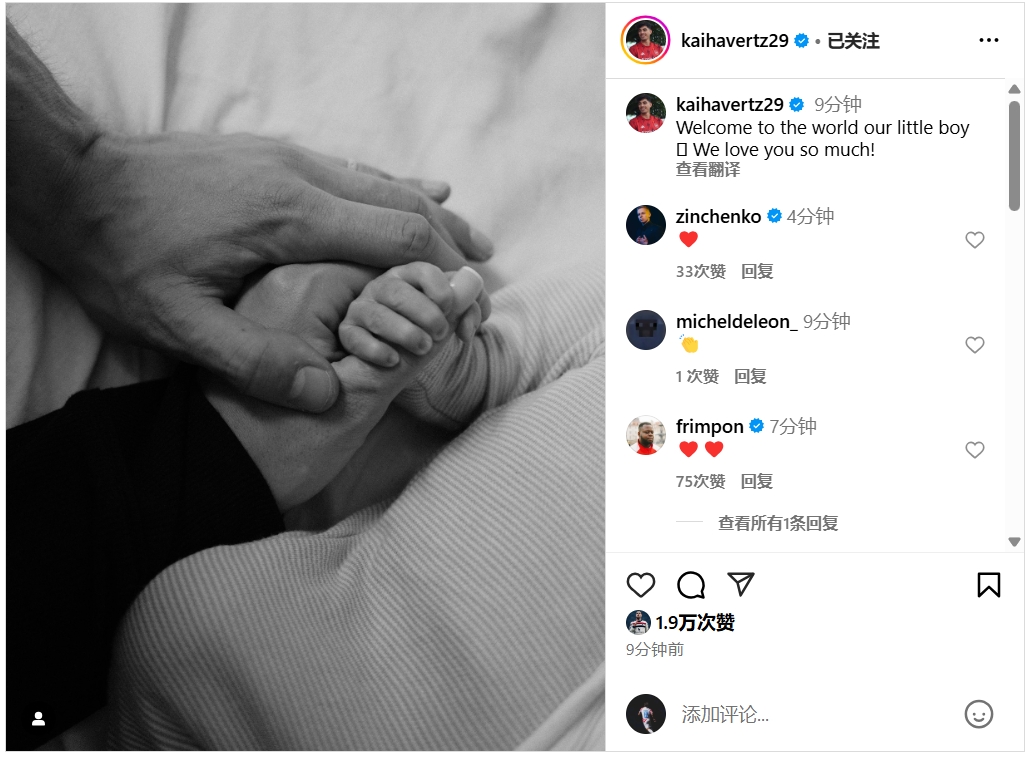 2025-03-26 21:01:48喜得贵子!哈弗茨社媒宣布当爹:欢迎来到这个世界,我们爱你