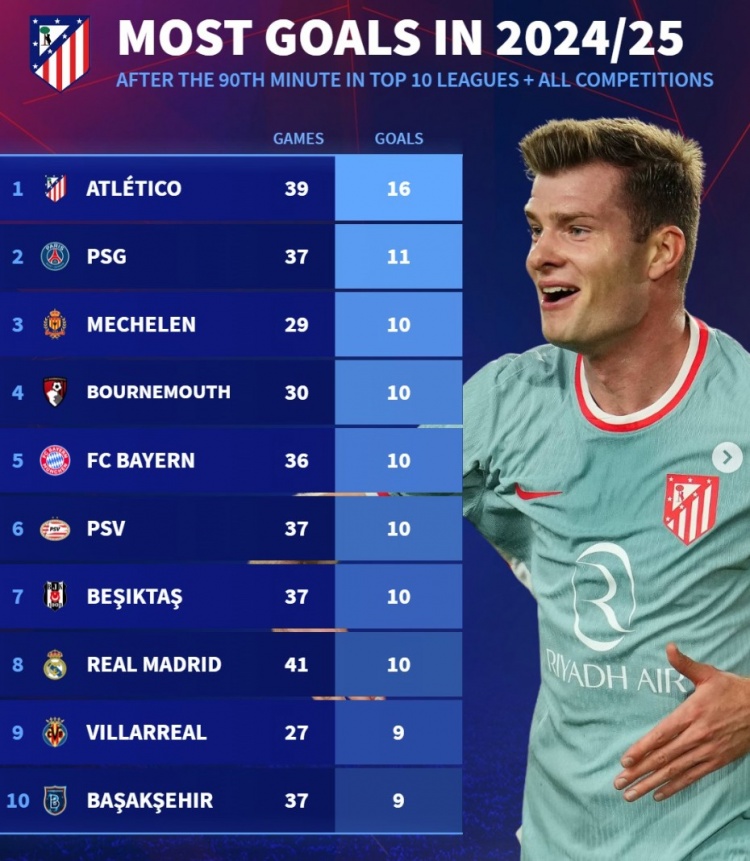 2025-02-27 00:01:34本赛季90分钟后进球榜:马竞16球居首,巴黎、拜仁、皇马在列