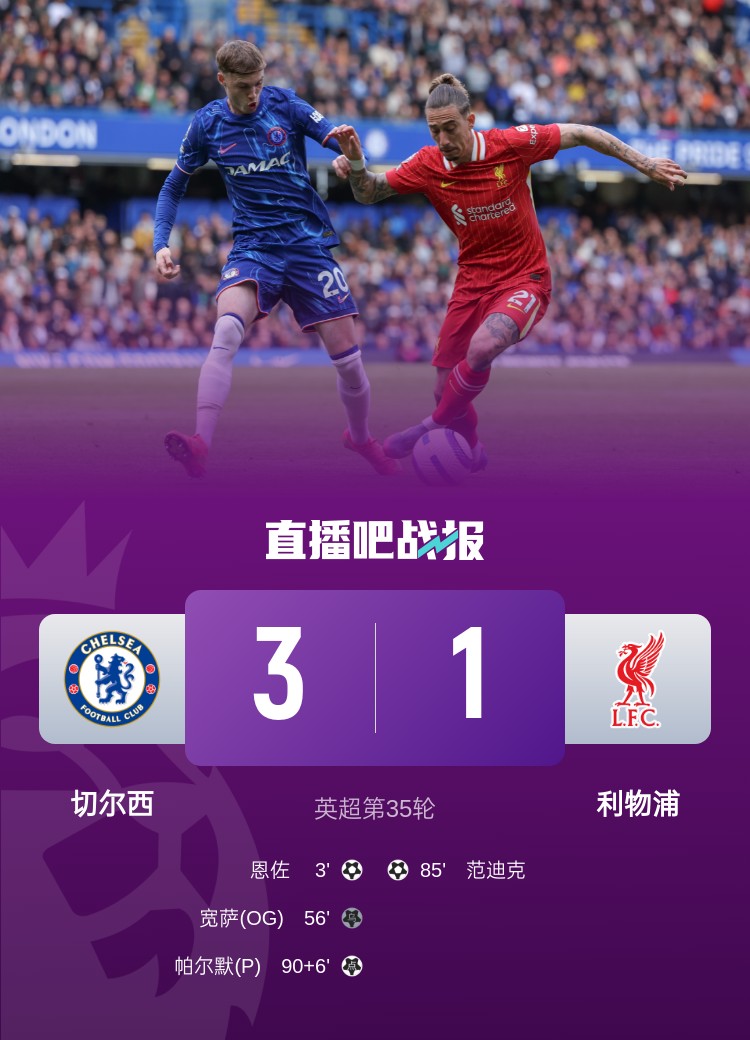 英超第35轮,切尔西3-1击败利物浦。上半场,恩佐开场3分钟破门,萨拉赫错失良机,凯塞多传球击中横梁;下半场,宽萨自摆乌龙,帕尔默几乎0度角射中立柱,范迪克头球扳回一球,凯塞多补时造点,帕尔默主罚点球命中。