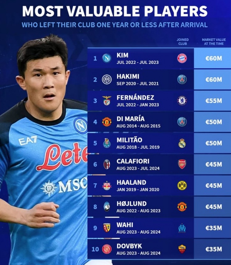 1.金玟哉(那不勒斯→拜仁),6000万