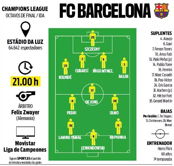 3月5日讯 巴萨将在今晚的欧冠1/8决赛首回合客场对阵本菲卡,《每日体育报》则对巴萨首发进行了预测,其中中场三人组将是奥尔莫、德容和佩德里。