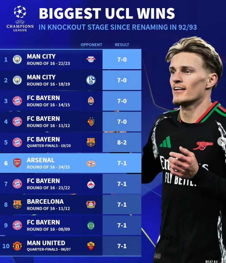 3月5日讯 阿森纳在本轮欧冠客场7-1血洗埃因霍温,《转会市场》也统计了改制后的欧冠淘汰赛单场最大比分胜利情况。