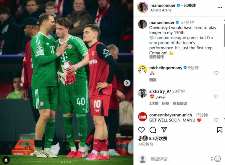 2025-03-06 08:20:10因伤下场,诺伊尔社媒晒照:我本希望在第150场欧冠踢更长时间